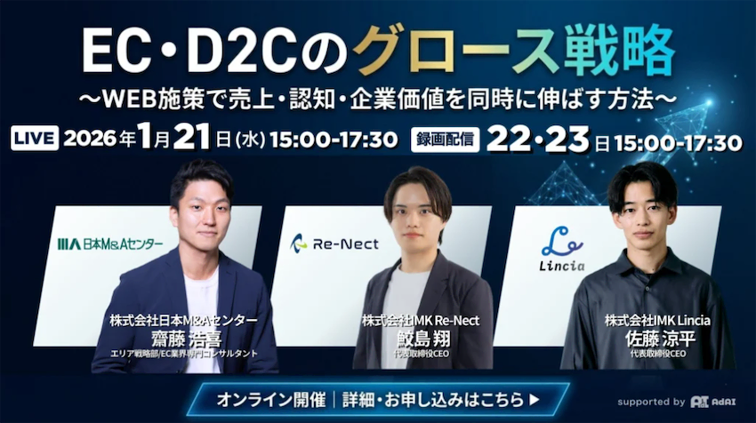 M&A大手の日本M&Aセンターは1月21日、EC・D2Cのグロース戦略をテーマに「WEB施策で売上・認知・企業価値を同時に伸ばす方法」のオンラインセミナーを無料で ...